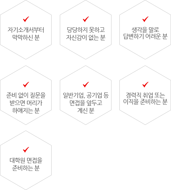 실전경험을 익히며 반복적인 모의면접을 통해 면접상황을 자연스럽게 받아들이도록 합니다.