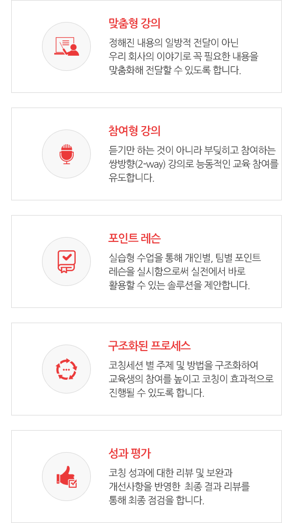 고객사의 가치체계를 내재화하고 직무 기본 역량을 강화하기 위한 신규입사자 교육부터 사원, 중간관리자, 팀장, 임원까지 각 직급별 직군별 프로그램을 차별화하여 전사교육체계에 맞는 맞춤별 교육모듈을 제공해 드리고 있습니다.