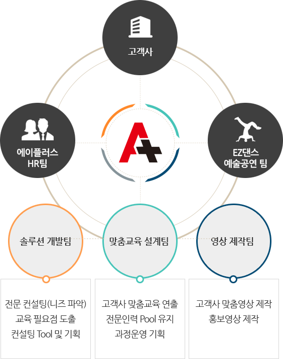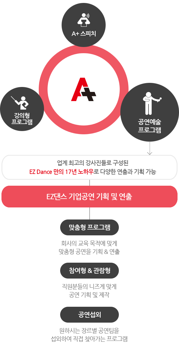 · 에이플러스 공연컨설팅은 예술을 통해 직장인 역량개발에 기여하고자 하는 EZ댄스 –예술공연 팀 Artist가 직접 연출합니다.