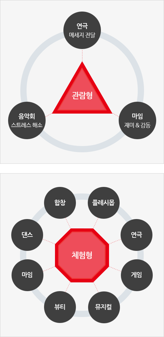 에이플러스 공연예술 프로그램은 메시지 전달에 주력한 관람형과 예술의 각 장르별로 구성된 체험형 강의로 구분됩니다.