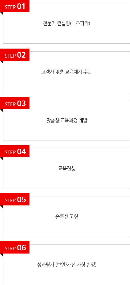 고객사의 가치체계를 내재화하고 직무 기본 역량을 강화하기 위한 신규입사자 교육부터 사원, 중간관리자, 팀장, 임원까지 각 직급별 직군별 프로그램을 차별화하여 전사교육체계에 맞는 맞춤별 교육모듈을 제공해 드리고 있습니다.