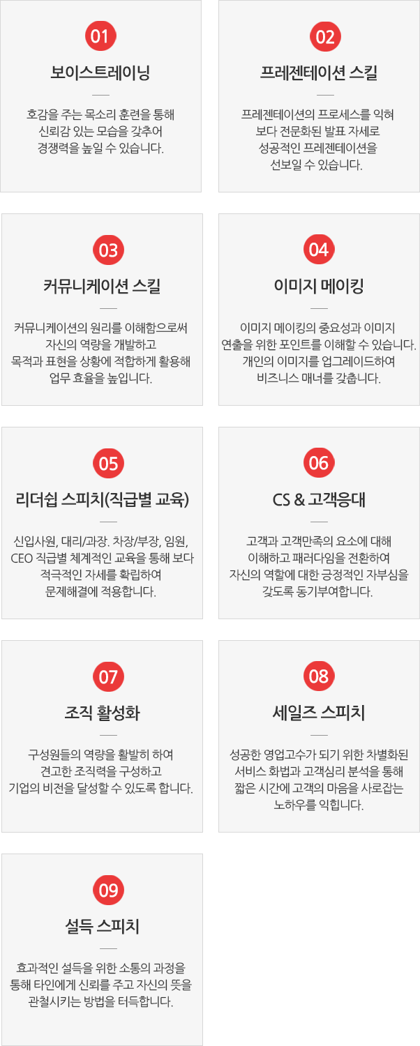 프리젠테이션부터 위기관리까지 고객사의 현황에 꼭 필요한 내용을 맞춤화해 교육을 진행합니다.