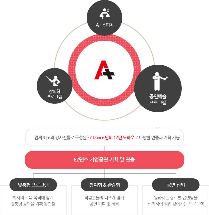 · 에이플러스 공연컨설팅은 예술을 통해 직장인 역량개발에 기여하고자 하는 EZ댄스 –예술공연 팀 Artist가 직접 연출합니다.