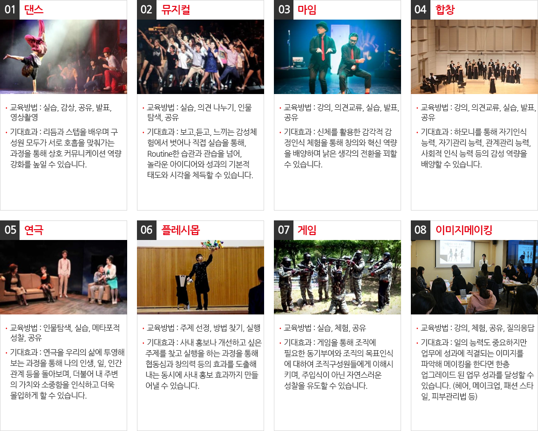 모든 교육 장르는 전문가 코칭을 바탕으로 그룹별 교육 및 공연이 진행됩니다.